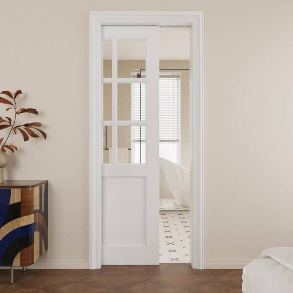 28 in. x 80 in. 6 Lite Clear Glass White Primed MDF Pocket Sliding Door with Pocket Door Hardware Set and Soft Close