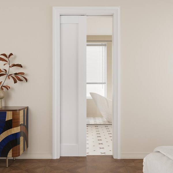 28 in. x 96 in. White Blank Primed Solid Core Door Slab with Wood Pocket Door Frame and Hardware (Soft Close Included)
