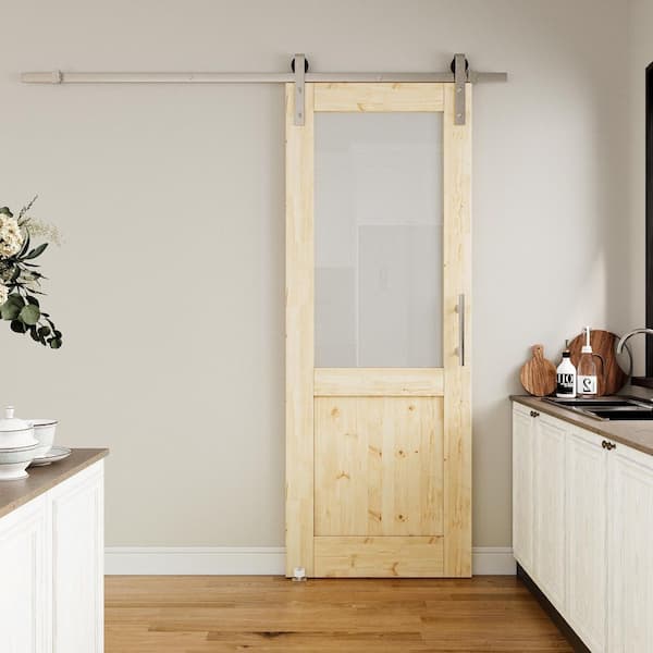 30 in. x 80 in. 1/2-Lite Frosted Glass Unfinished Glass Sliding Barn Door with Hardware Kit Nickel Plated