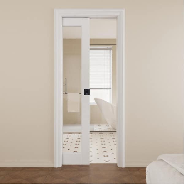 30 in. x 80 in. 1-Lite Clear Glass White Primed MDF Pocket Sliding Door with Hardware (Soft Close and Black Lock Incl)