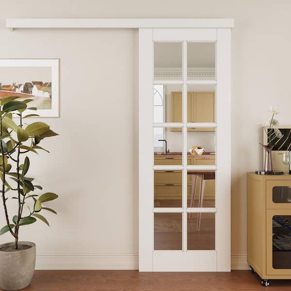 30 in. x 80 in. 10-Lite Clear Glass White Primed MDF Sliding Barn Door with Hardware Kit Hidden Track Style