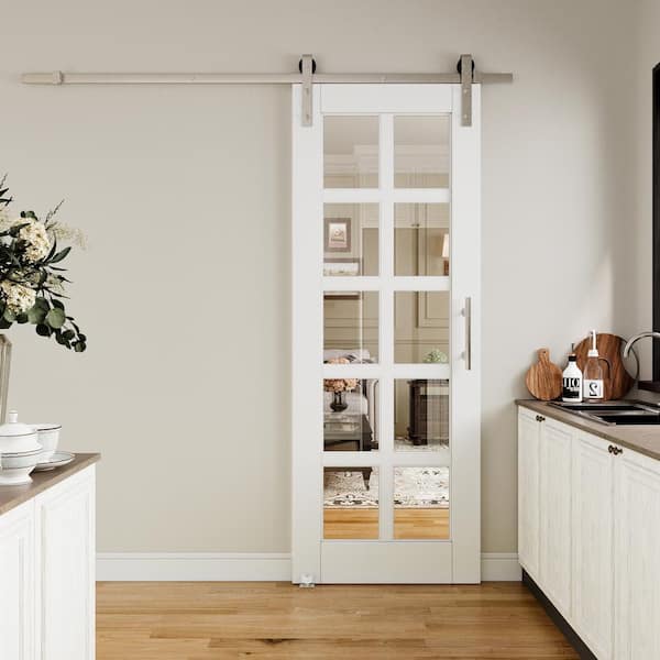 30 in. x 80 in. 10-Lite Clear Glass White Primed Sliding Barn Door with Hardware Kit Nickel Plated