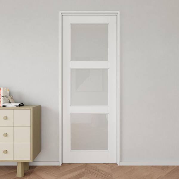 30 in. x 80 in. 3-Lite Frosted Glass Left Handed White Solid Core MDF Door with Quick Assemble Jamb Kit