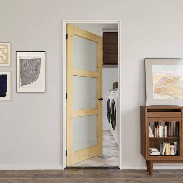 30 in. x 80 in. 3-Lite Frosted Glass Left Solid Core Pine Glass Single Prehung Interior Door with Quick Assemble Jamb