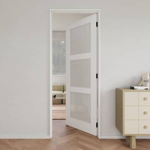 30 in. x 80 in. 3-Lite Frosted Glass Right White Solid Core Glass Single Prehung Interior Door with Quick Assemble Jamb