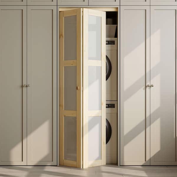 30 in. x 80 in. 3-Lite Frosted Glass Solid Core Unfinished Pine Glass Interior Closet Bi-fold Door with Hardware