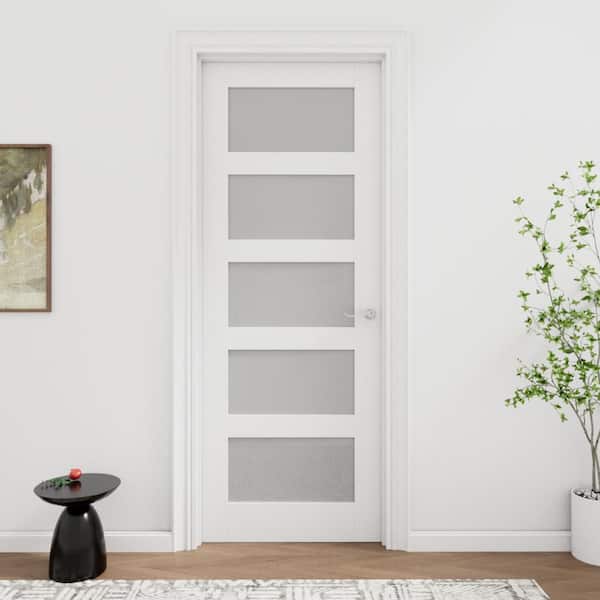 30 in. x 80 in. 5-Lite Frosted Glass Left White Solid Core Glass Single Prehung Interior Door with Quick Assemble Jamb