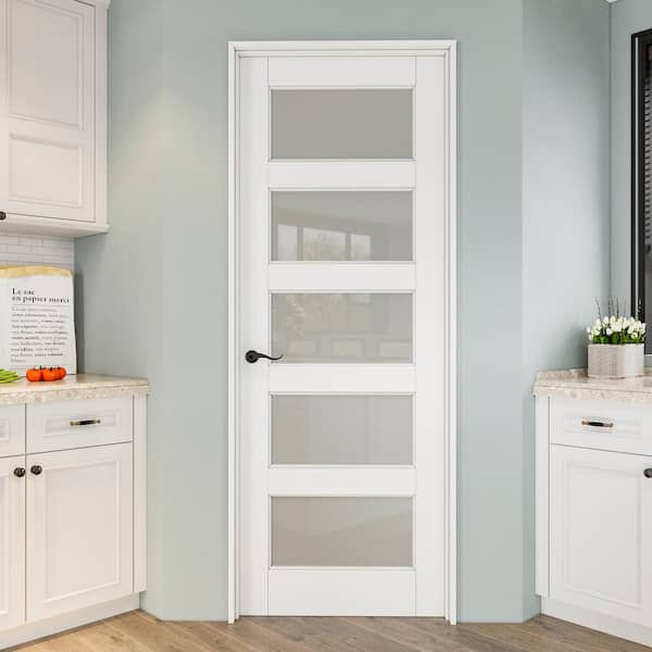 30 in. x 80 in. 5-Lite Frosted Glass Right White Solid Core Wood Single Interior Door with Quick Assemble Jamb