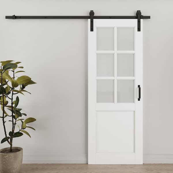 30 in. x 80 in. 6 Lite Tempered Frosted Glass White Primed Solid Core MDF Sliding Barn Door with Hardware Kit