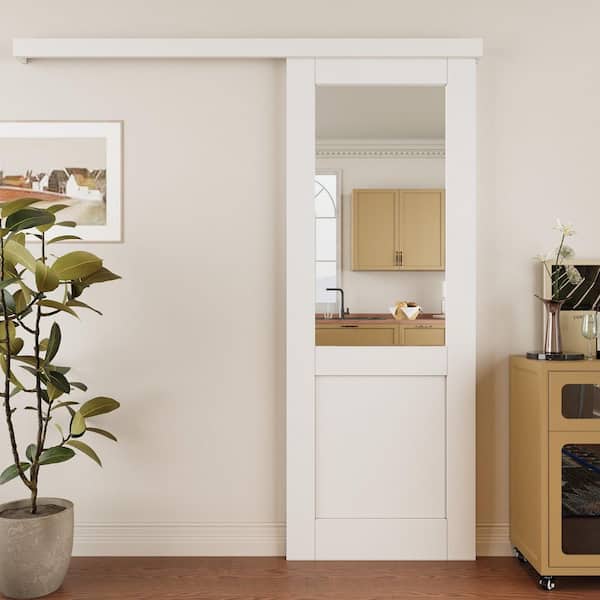 30 in. x 80 in. Hidden Track Style 1/2-Lite Clear Glass White Primed MDF Sliding Barn Door with Hardware Kit