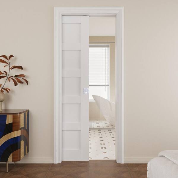 30 in. x 80 in. Paneled 5-Lite White Primed MDF Pocket Sliding Door With Hardware Kit (Soft Close and Silver Lock Incl)