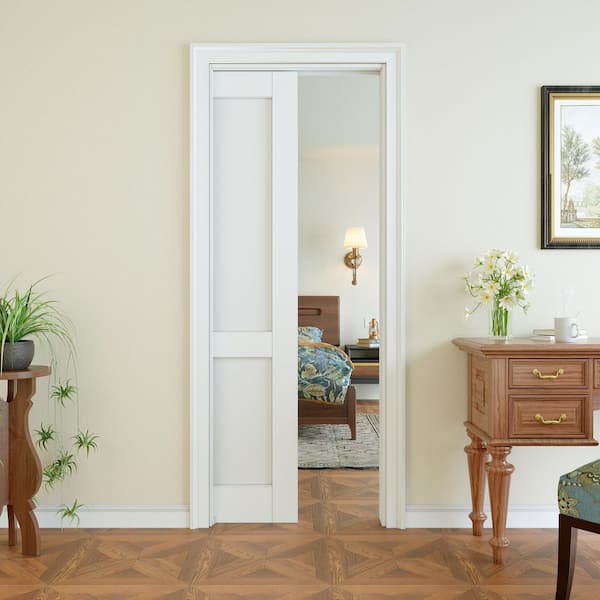 30 in. x 80 in. White Primed 2 Lite Wood Door with Solid Core Sliding Pocket Door Frame with Hardware and Soft Close