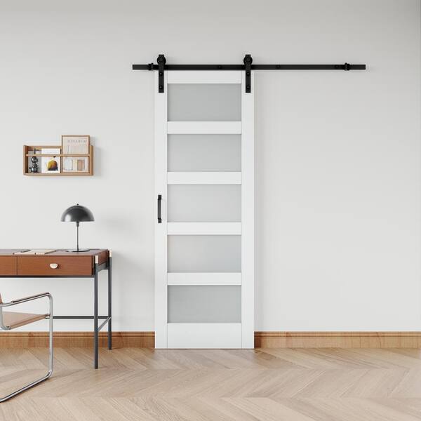 30 in. x 84 in. 5 Lite Tempered Frosted Glass and Solid Core MDF White Primed Sliding Barn Door with Hardware Kit