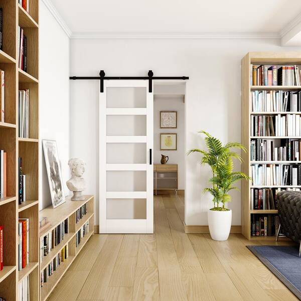 30 in. x 84 in. 5 Lite White Tempered Frosted Glass Off-White Finished MDF Barn Door Slab with Hardware