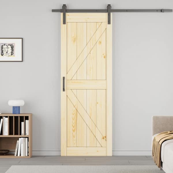 30 in. x 84 in. K-Shape Solid Core Pine Wood Unfinished Sliding Barn Door Slab with Hardware Kit