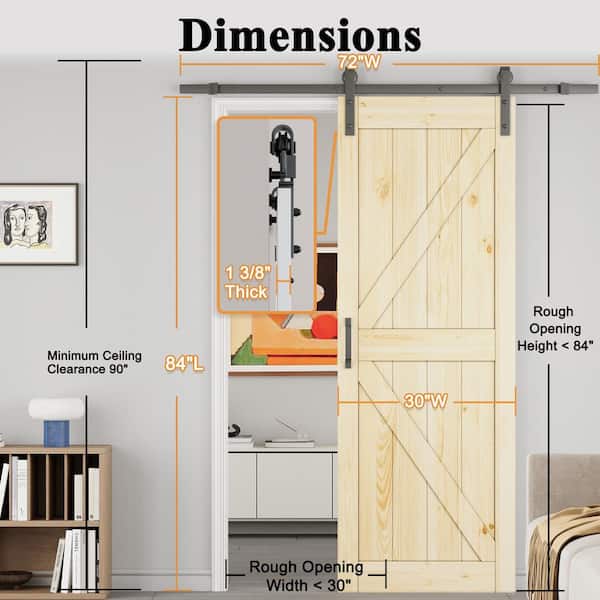 30 in. x 84 in. Paneled K Shape Solid Pine Unfished Wood Sliding Barn Door Slab with Installation Hardware Kit