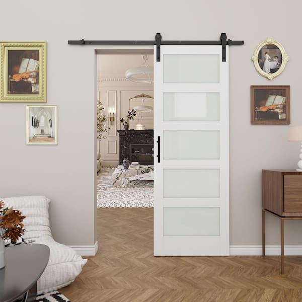 30 in. x 96 in. 5 Lite Tempered Frosted Glass White Primed MDF Wood Sliding Barn Door with Hardware Kit