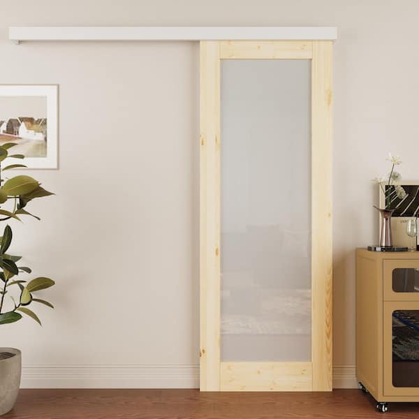 30 in. x 96 in. Hidden Track Style 1-Lite Frosted Glass Unfinished Glass Sliding Barn Door with Hardware Kit
