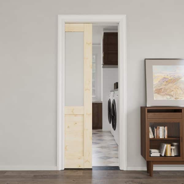 32 in. x 80 in. 1/2-Lite Frosted Glass Unfinished Door Solid Core Pine Pocket Door Frame and Hardware (Soft Close Incl)