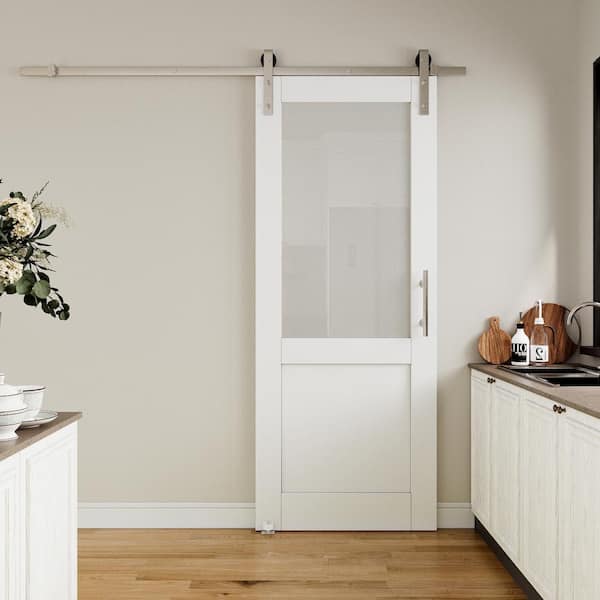 32 in. x 80 in. 1/2 Lite Tempered Frosted Glass White Primed MDF Sliding Barn Door with Hardware Kit Nickel Plat