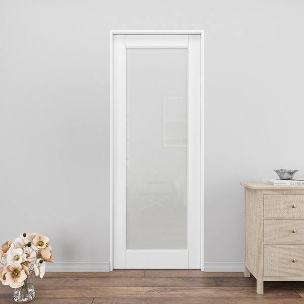 32 in. x 80 in. 1-Lite Frosted Glass Primed White Pocket Sliding Door with Pocket Door Frame, Jamb and Hardware Kit