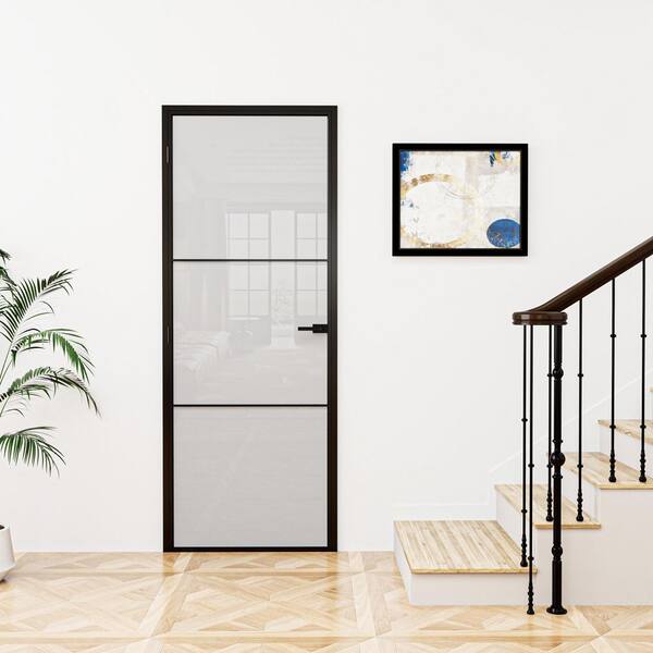 32 in. x 80 in. 3-Lite Frosted Glass Right Black Finished Aluminun Interior Door Slab+ Free Aluminun Jamb & Lockset