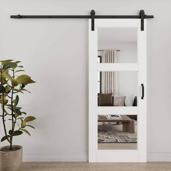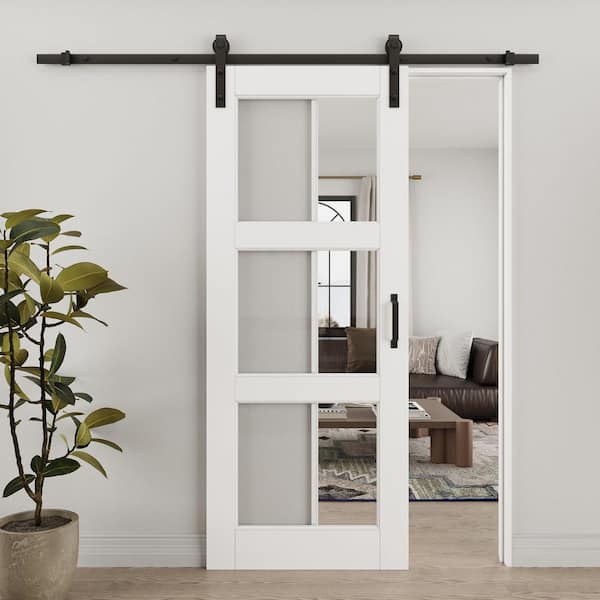 32 in. x 80 in. 3-Lite Tempered Clear Glass White Primed Solid Core MDF Sliding Barn Door with Hardware Kit