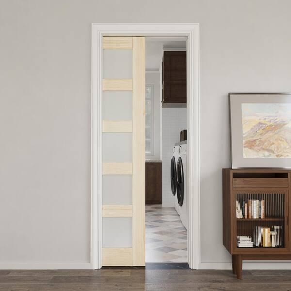 32 in. x 80 in. 5-Lite Frosted Glass Unfinished Door Solid Core Pine Pocket Door Frame and Hardware (Soft Close Incl)