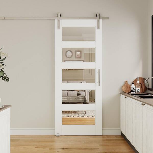 32 in. x 80 in. 5-Lite Tempered Clear Glass White Primed Solid Core MDF Sliding Barn Door with Hardware Kit Nickel