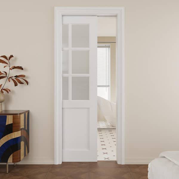 32 in. x 80 in. 6-Lite Frosted Glass White Primed MDF Pocket Sliding Door with Pocket Door Hardware Set and Soft Close