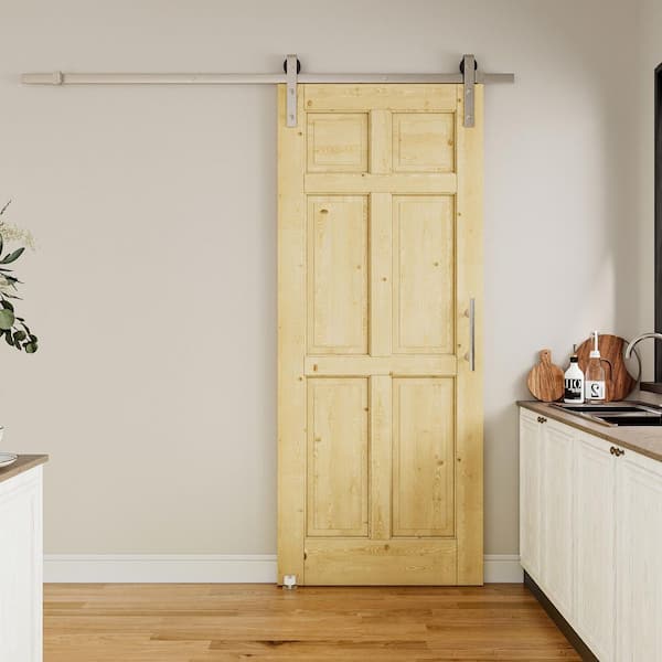 32 in. x 80 in. 6-Panel Solid Pine Wood Unfished Sliding Barn Door with Hardware Kit Nickel Plated