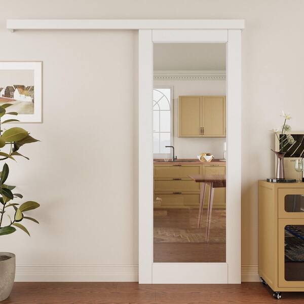 32 in. x 80 in. Hidden Track Style 1-Lite Clear Glass White Primed MDF Sliding Barn Door with Hardware Kit