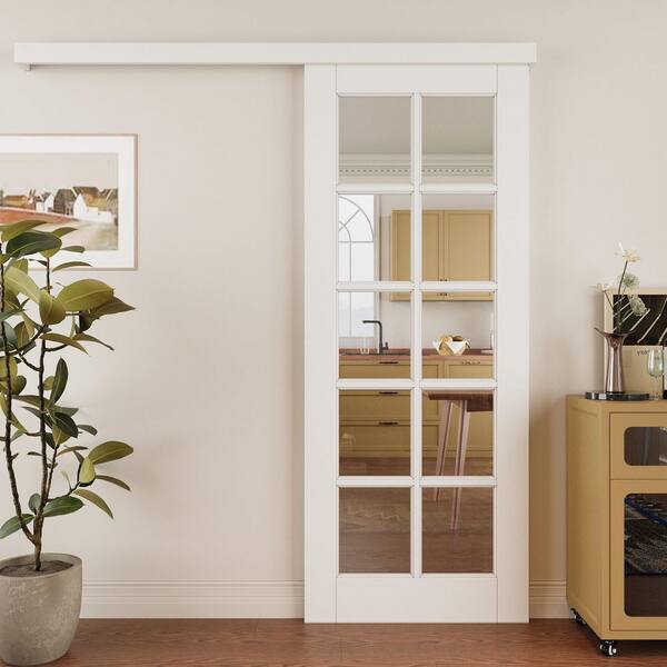 32 in. x 80 in. Hidden Track Style 10-Lite Clear Glass White Primed MDF Sliding Barn Door with Hardware Kit
