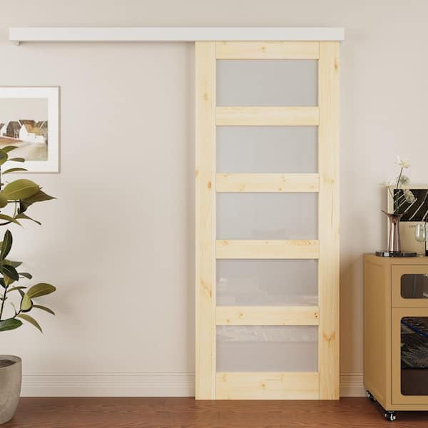 32 in. x 80 in. Hidden Track Style 5-Lite Frosted Glass Unfinished Glass Sliding Barn Door with Hardware Kit