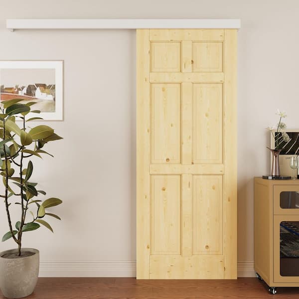 32 in. x 80 in. Hidden Track Style 6-Panel Solid Pine Wood Unfished Sliding Barn Door with Hardware Kit