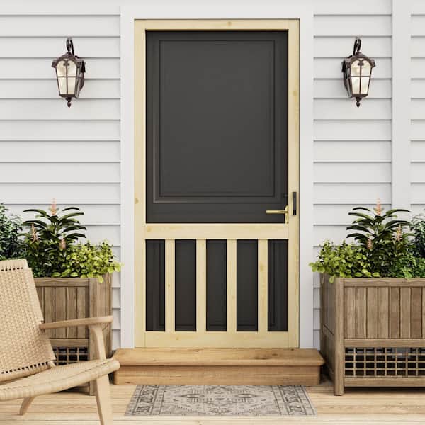 32 in. x 80 in. Universal Unfinished Pine Vertical Slat Screen Door with Lock-Classic 5-Bar Style Gauze Mesh Hinged Door