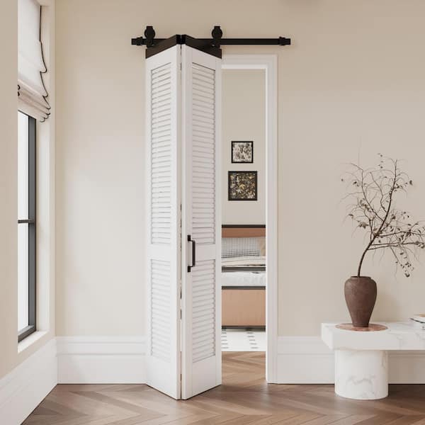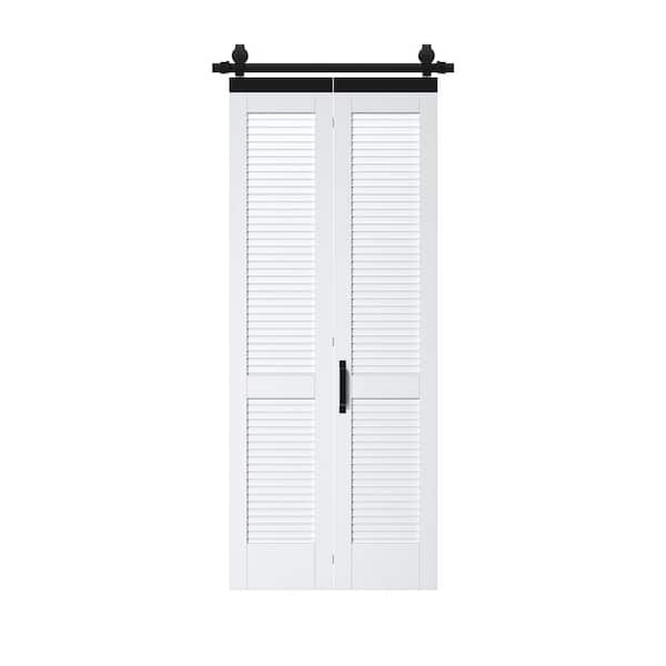 34 in. x 84 in. White Primed Pine Wood Louver Bi-Fold Sliding Barn Door with Hardware Kit