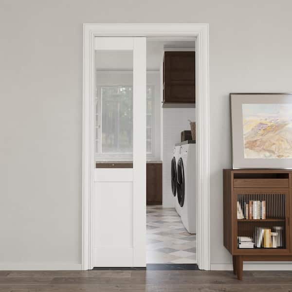 36 in. x 80 in. 1/2-Lite Clear Glass Primed Solid Core Glass Pocket Door Frame and Hardware Soft Close Included