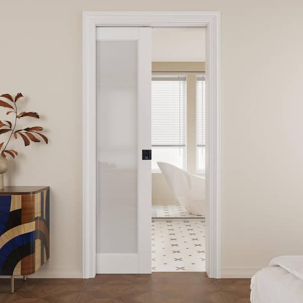36 in. x 80 in. 1-Lite Frosted Glass Primed Door Wood Pocket Door Frame and Hardware (Soft Close and Black Lock Incl)