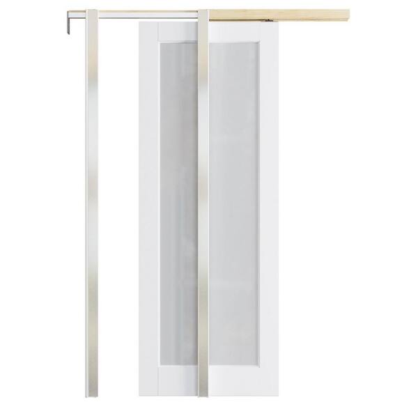 36 in. x 80 in. 1-Lite Frosted Glass Primed Door Wood Pocket Door Frame and Hardware (Soft Close and Black Lock Incl)