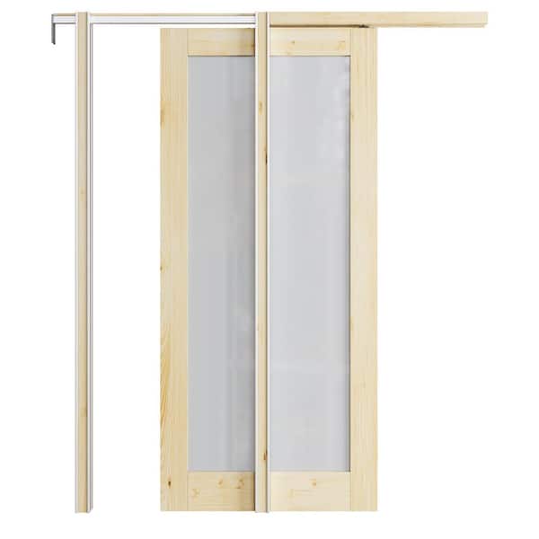 36 in. x 80 in. 1-Lite Frosted Glass Solid Core Pine Wood Unfinished Pocket Sliding Door with Pocket Door Hardware