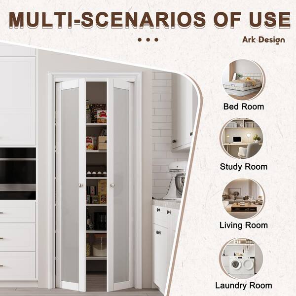 36 in. x 80 in. 1-Lite Frosted Glass Solid Core White Finished MDF Pantry Pivot Bi-fold Door with Pivot Hareware