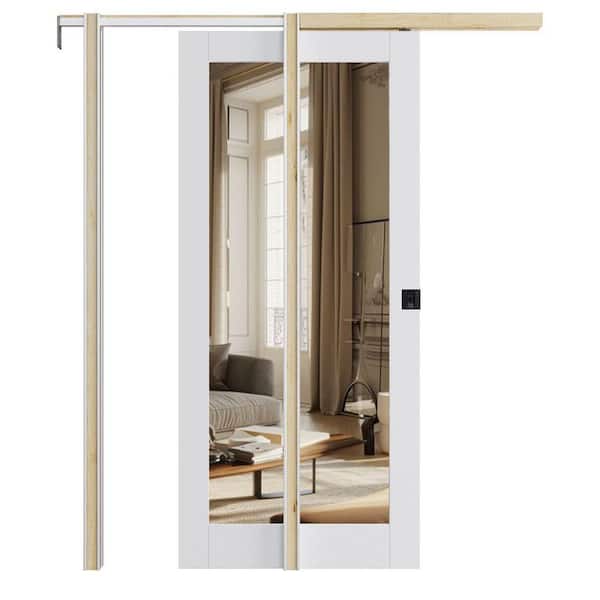 36 in. x 80 in. 1-Lite Mirrored Glass White Door with Pocket Door Frame and Hardware (Soft Close and Black Lock Incl)