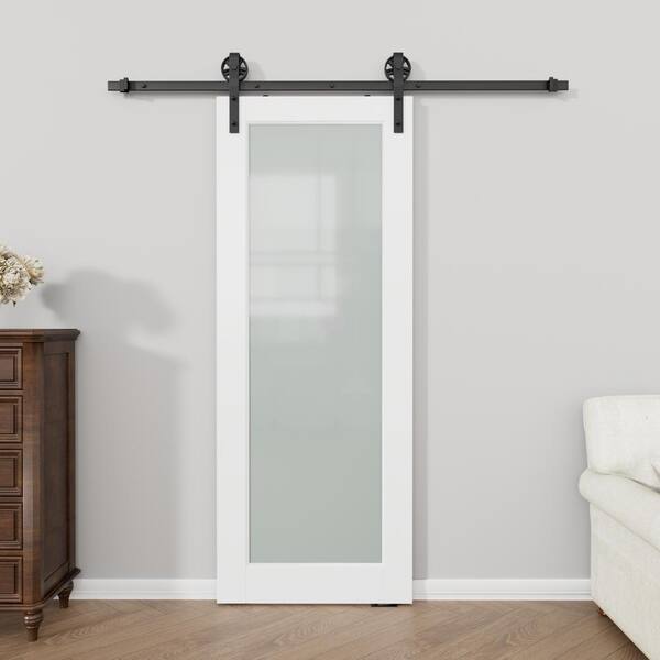 36 in. x 80 in. 1 Lite Tempered Frosted Glass White Primed Sliding Barn Door with Hardware Kit