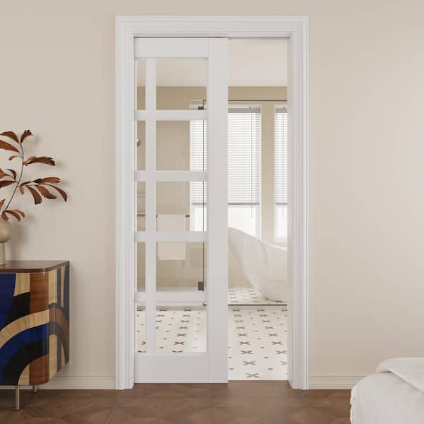 36 in. x 80 in. 10-Lite Clear Glass Primed Solid Core Glass Pocket Door Frame and Hardware Soft Close Included