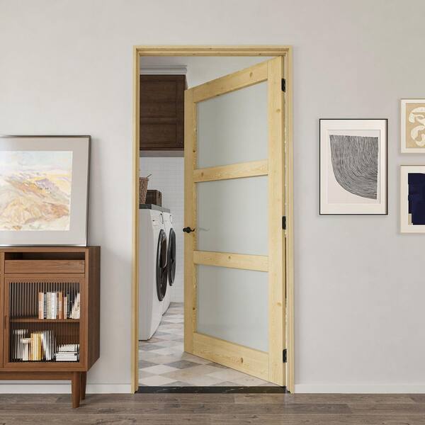 36 in. x 80 in. 3-Lite Frosted Glass Right Solid Core Pine Wood Single Interior Door with Quick Assemble Jamb
