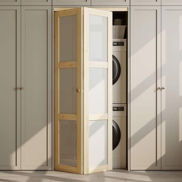 36 in. x 80 in. 3-Lite Frosted Glass Solid Core Unfinished Pine Glass Interior Closet Bi-Fold Door with Hardware