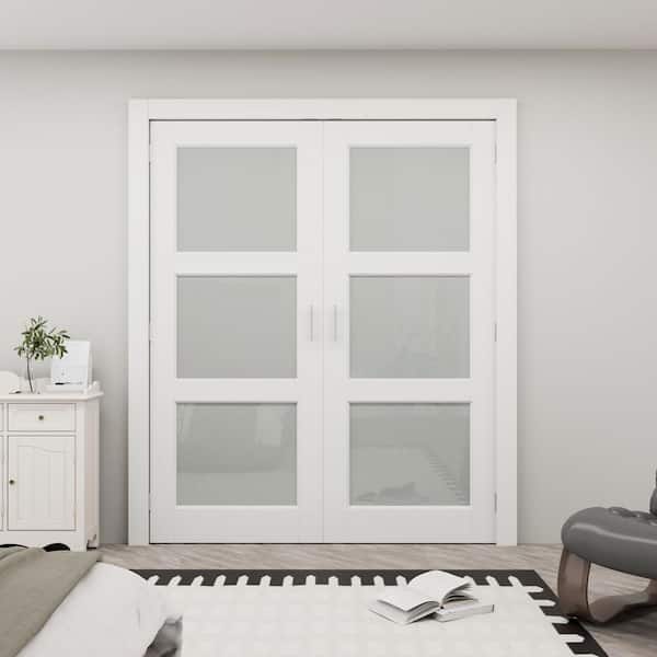 36 in. x 80 in. 3 Lite Frosted Glass White Solid Core Finished Glass Double Slab Door Panel Bi-Fold Door with Ball Catch