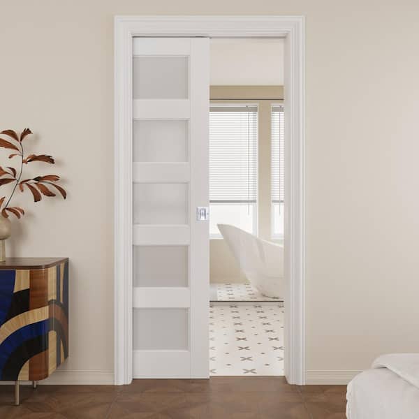 36 in. x 80 in. 5-Lite Frosted Glass Primed Door White Pocket Door Frame and Hardware (Soft Close and Silver Lock Incl)