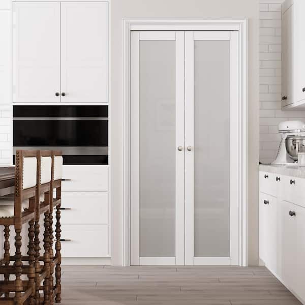 36 in. x 80 in. Solid Core Frosted Glass MDF Bi-fold Door Plus French Style Pantry Pivot Hardware (1-Lite White Finish)